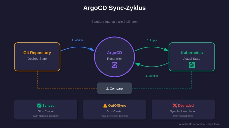 💡 Neu bei GitOps? Stell dir vor, du hast einen Roboter, der alle 3 Minuten prüft: „Stimmt der Cluster noch mit Git überein?“ Wenn nicht, korrigiert er automatisch. Das ist GitOps.