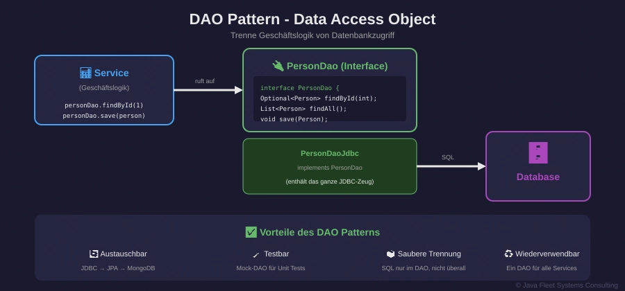 Der Service-Code sieht kein SQL. Das DAO kapselt alles.