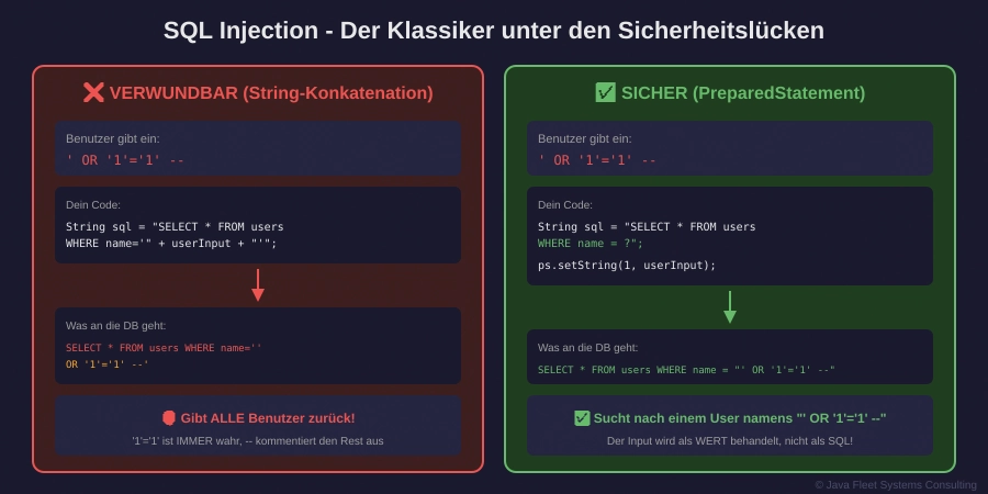 // Benutzer gibt ein: ' OR '1'='1' -- String userInput = "' OR '1'='1' --"; // ❌ FALSCH: String-Konkatenation String sql = "SELECT * FROM users WHERE name='" + userInput + "'"; // Ergebnis: // SELECT * FROM users WHERE name='' OR '1'='1' --' // ↓ // Gibt ALLE Benutzer zurück!