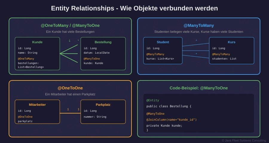 Abbildung 2: @OneToOne, @OneToMany/@ManyToOne, @ManyToMany