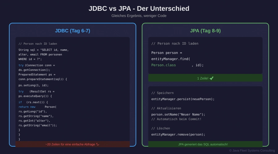 // JDBC (Tag 6): ~20 Zeilen für eine Abfrage String sql = "SELECT * FROM personen WHERE id = ?"; // ... Connection, PreparedStatement, ResultSet, Mapping ... // JPA (heute): 1 Zeile! Person person = entityManager.find(Person.class, id);