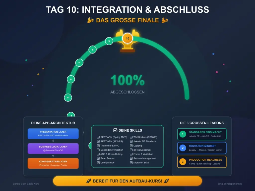 Heute ist dein letzter Tag des Spring Boot Basic Kurses. Aber es ist nicht das Ende – es ist der Anfang deiner Karriere als moderner Java-Entwickler!