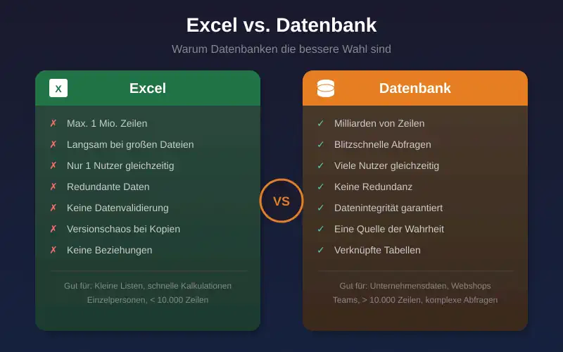 Klingt viel? Ein mittelgroßer Online-Shop hat schnell 100.000 Bestellungen pro Jahr. Mit allen Positionen, Kundendaten und Produktinfos bist du schneller am Limit als du denkst. Eine Datenbank kennt solche Grenzen praktisch nicht.