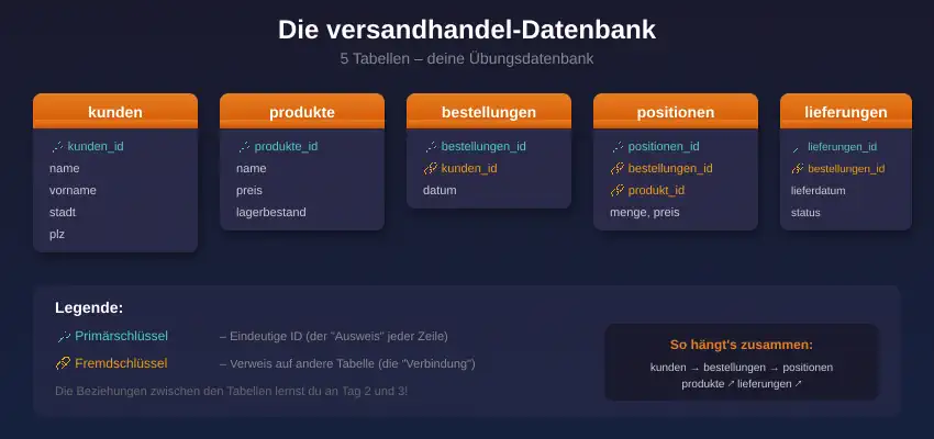 In den nächsten Tagen arbeiten wir mit einer Beispiel-Datenbank namens versandhandel. Sie simuliert einen kleinen Online-Shop.