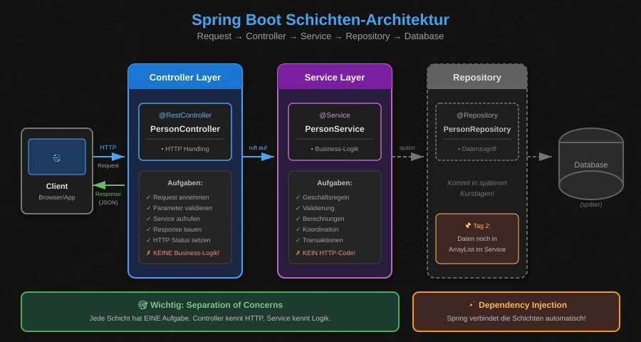 Warum wichtig? Morgen wechselst du von JSON zu echten Webseiten! Du baust dieselbe Person-API, aber mit HTML statt JSON-Response. Dein PersonService wird wiederverwendet – das ist die Macht der Service-Architektur!