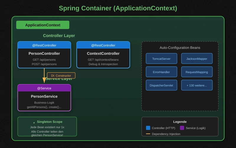 Gestern hast du eine REST API gebaut. Aber was passiert da eigentlich im Hintergrund? Heute schauen wir hinter die Kulissen von Spring Boot und verstehen den Spring Container – das Herz jeder Spring-Anwendung! Du lernst, wie Spring deine Objekte verwaltet und wie du Dependency Injection richtig einsetzt.