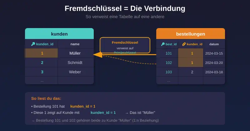 Stell dir vor, jede Zeile hat einen Ausweis (Primärschlüssel). Und wenn eine Tabelle auf eine andere verweisen will, merkt sie sich die Ausweisnummer (Fremdschlüssel).