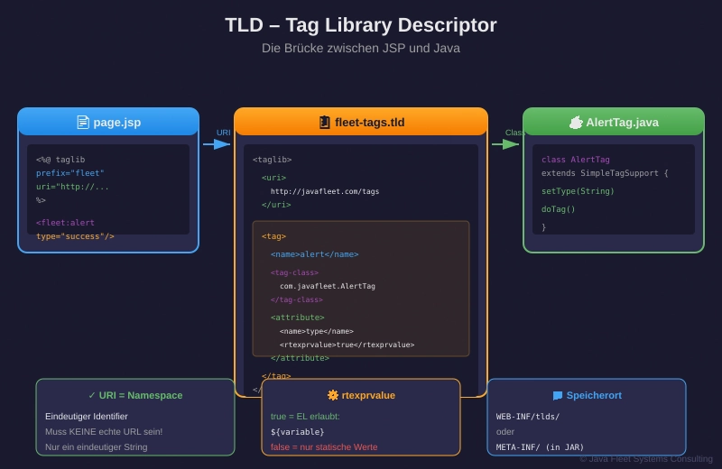 Der Tag Library Descriptor ist die Verbindung zwischen deinen Java-Klassen und den JSP-Tags. Lass uns jeden Teil verstehen: