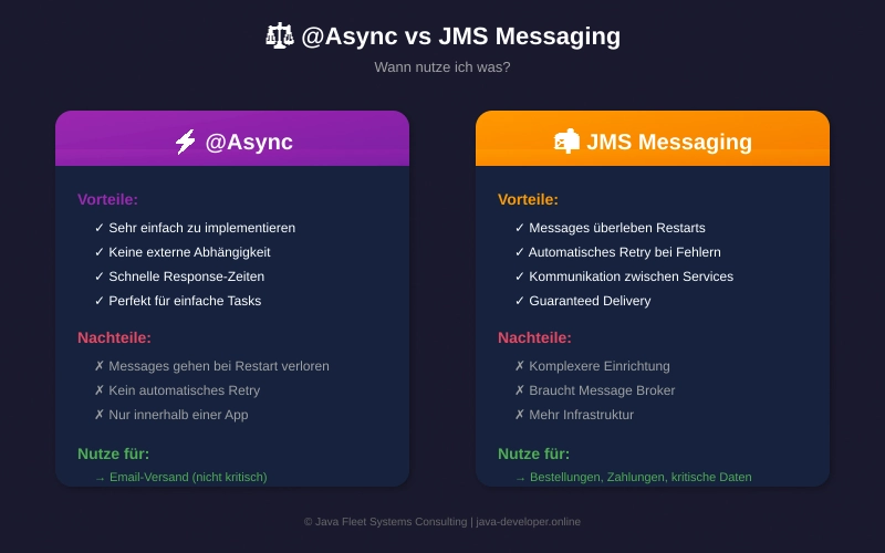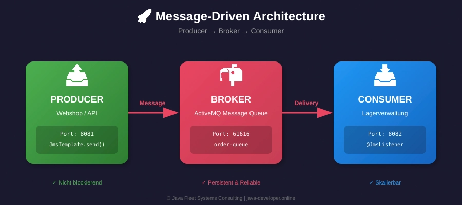 ✅ Message-Driven Architecture verstehen (Broker, Producer, Consumer) ✅ ActiveMQ als Message Broker einrichten ✅ Messages zwischen Services senden und empfangen ✅ Email-Versand mit Spring Boot Mail ✅ Synchron vs Asynchron (@Async) ✅ Wann JMS, wann @Async?