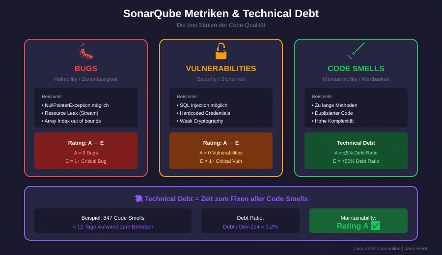 Die Lösung: SonarQube als finaler Quality Gate – misst Code-Quality, Technical Debt und findet Bugs, die Tests übersehen. Plus: Integration aller Tools für complete Quality-Pipeline!